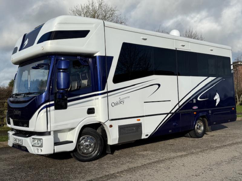 STUNNING 7.5 Ton 2017 Iveco Eurocargo 75E21 Automatic Coach built by Oakley coach builders. Oakley Supreme Model. Stalled for 3. Smart luxurious living. Sleeping for 4. Huge specification throughout. Only 25,610 Miles from new! No external tack lockers intruding into the horse area.