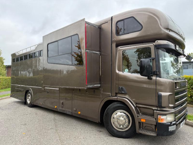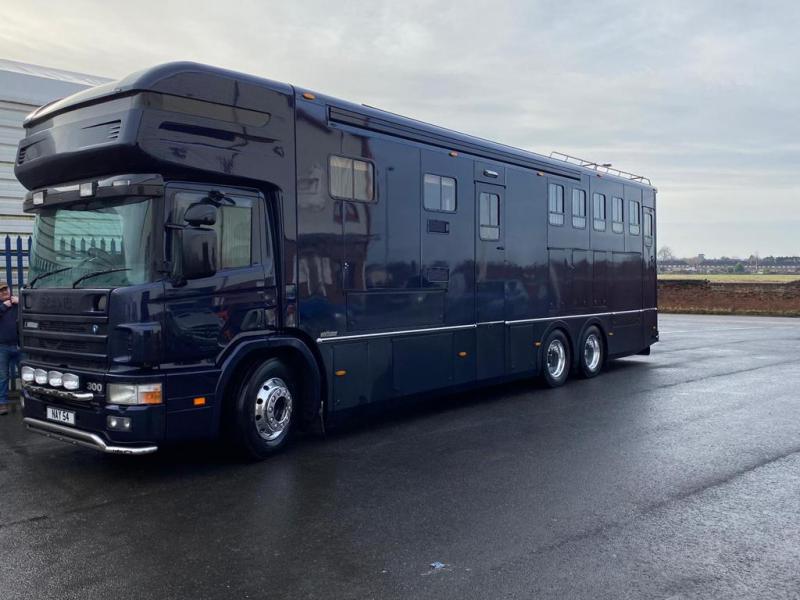 Scania 360 26 Ton Coach built by Highbarn Coach builders. Smart luxury living. Sleeping for 4 . Stalled for 6. Rear Air suspension.. Smart horsebox