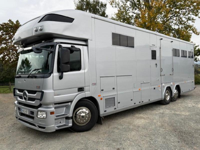 Beautiful 2012 Mercedes Benz Actros 440 26,000 kgs. Coach built by PRB coach builders. Stalled for 6. Side and rear ramp. Full luxury living, sleeping for up to 5 people. Huge specification. Stunning truck!