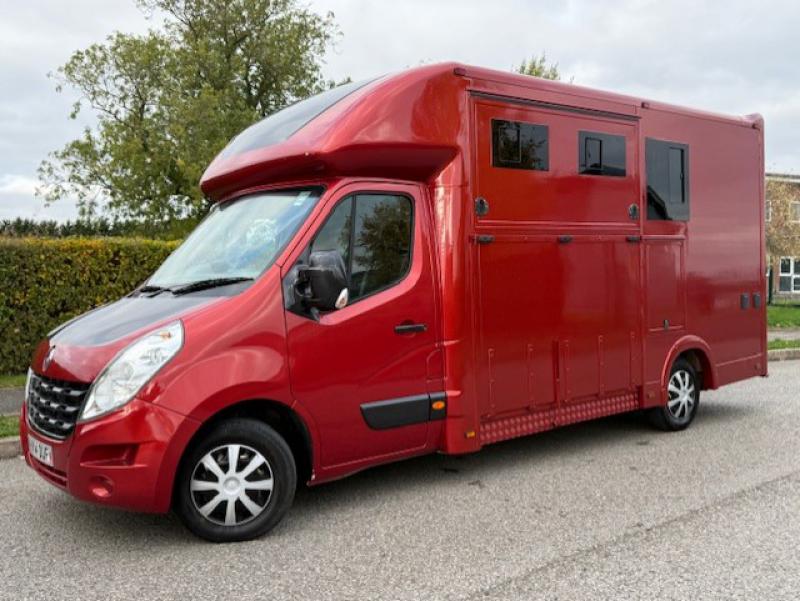 Beautiful 2014Renault Master 3.5 Ton Coach built by Newmarket Elite horseboxes. Weekender Model. Stalled for 2 rear facing.. Full wall. Smart living area at rear. External tack locker.. Only 69,392 Miles!