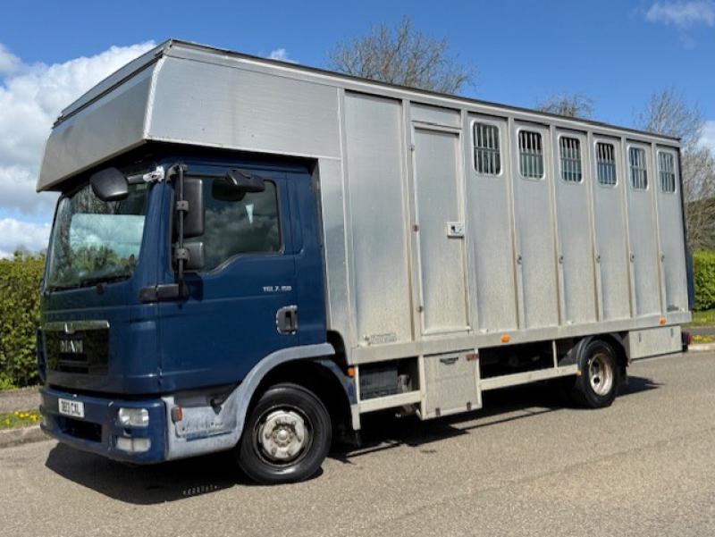 Beautiful 2010 Model 59 MAN TGL Automatic 7.5 Ton , coach built by FVM Horseboxes. Stalled for 3 with smart spacious living, sleeping for 4. Toilet and shower. External tack lockers. Rear air suspension. Full tilt cab