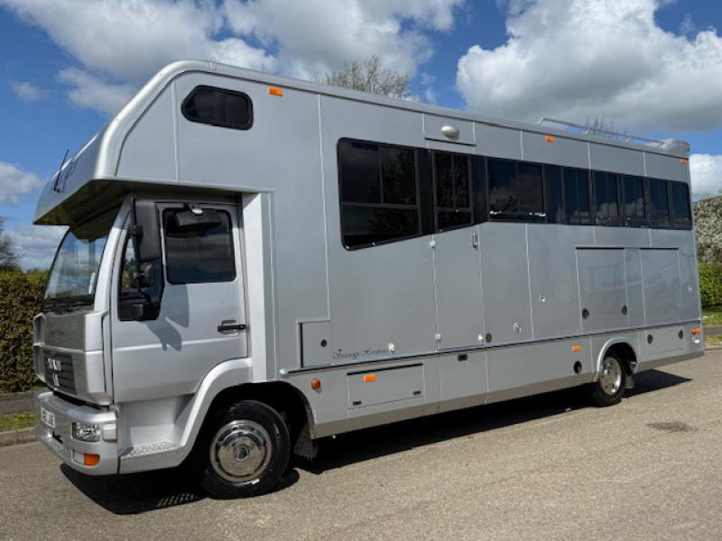 Beautiful 2010 Model 59 MAN TGL Automatic 7.5 Ton , coach built by FVM Horseboxes. Stalled for 3 with smart spacious living, sleeping for 4. Toilet and shower. External tack lockers. Rear air suspension. Full tilt cab