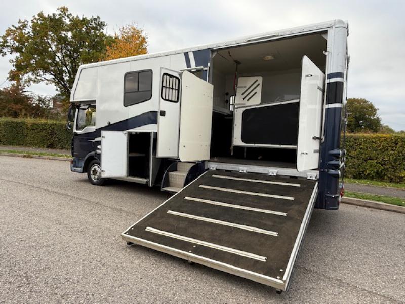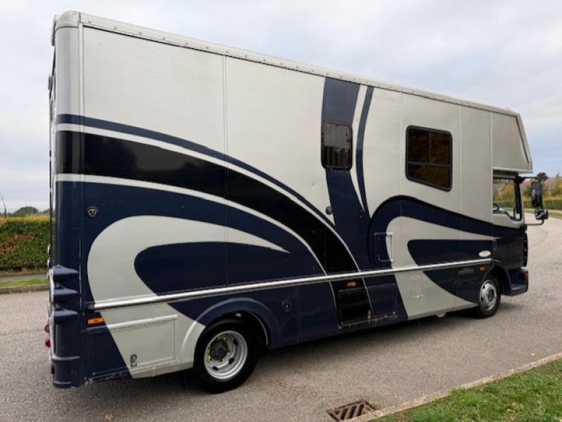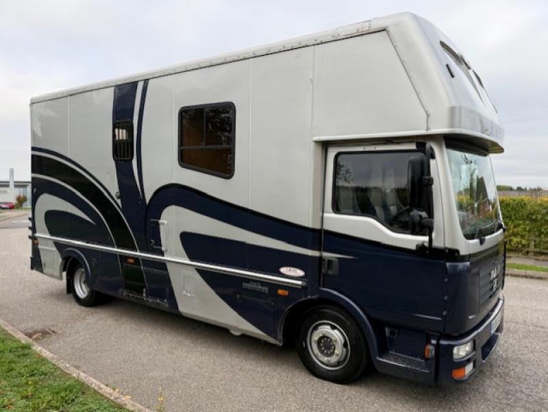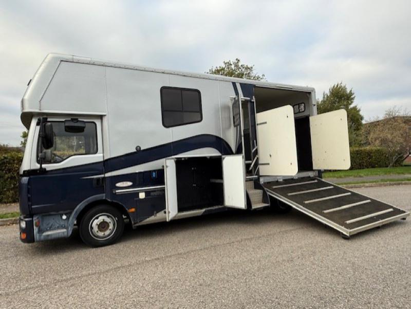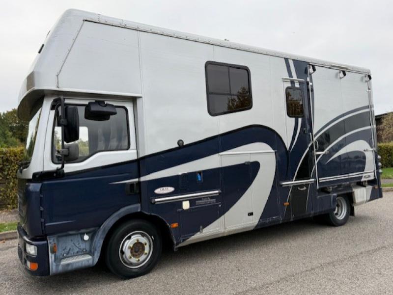 2006 MAN TGL Automatic 7.5 Ton Coach built by Grays Horseboxes. Stalled for 2 forward facing. Side ramp. Smart luxury living, sleeping for 4. Toilet and shower.. Full tilt cab