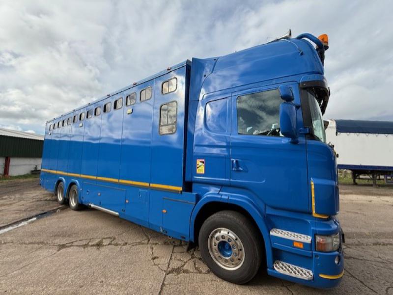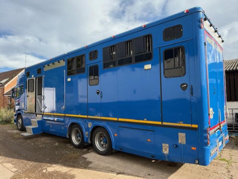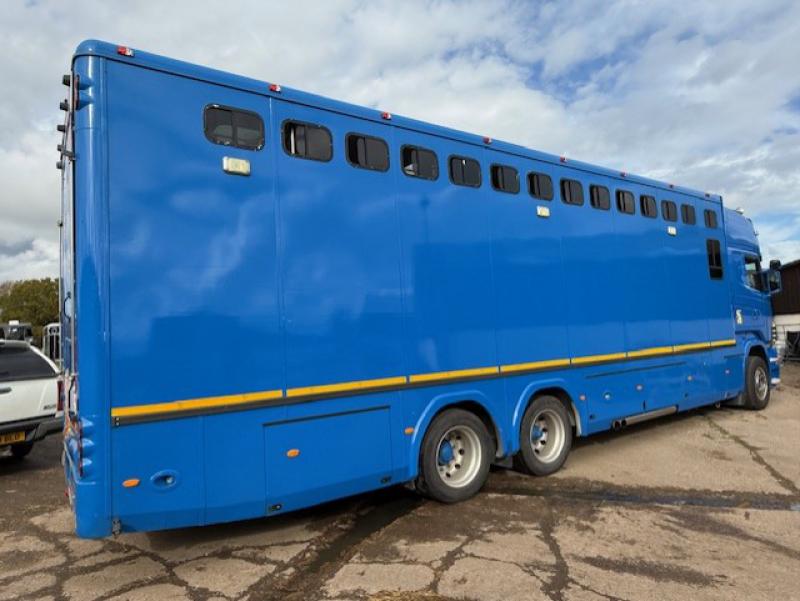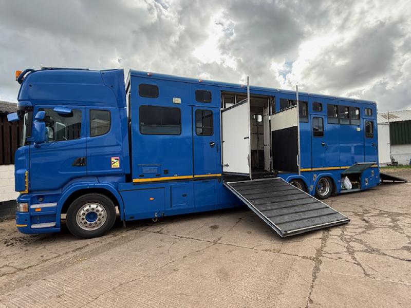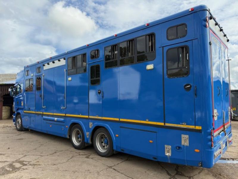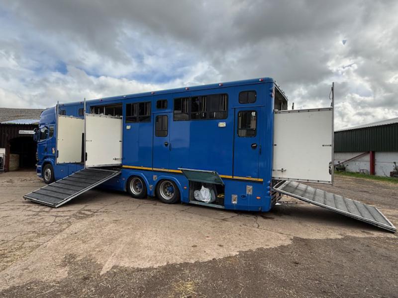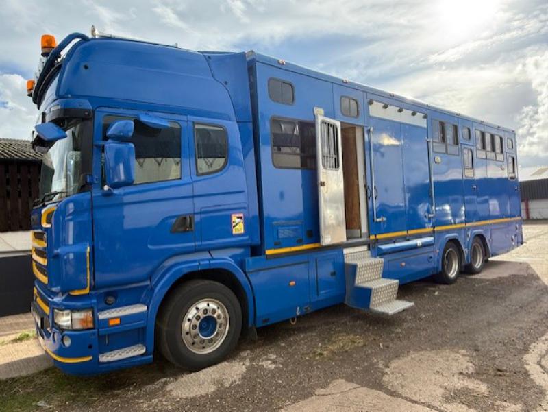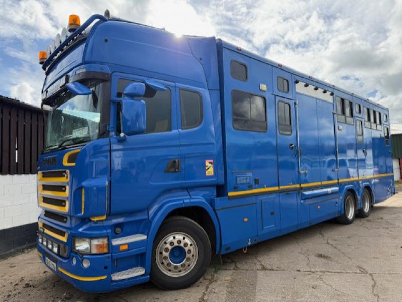 2008 Scania 420 Topline R cab 23,000 kg. 3 Axle. Coach built by Gazley Coach builders. Stalled for 10 with compact living area, Side and rear ramp. Full tilt cab. Side and rear ramp