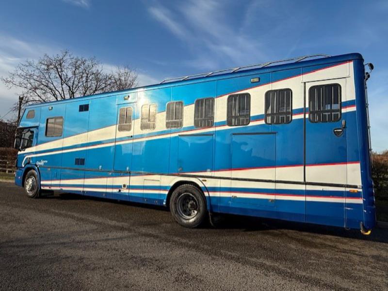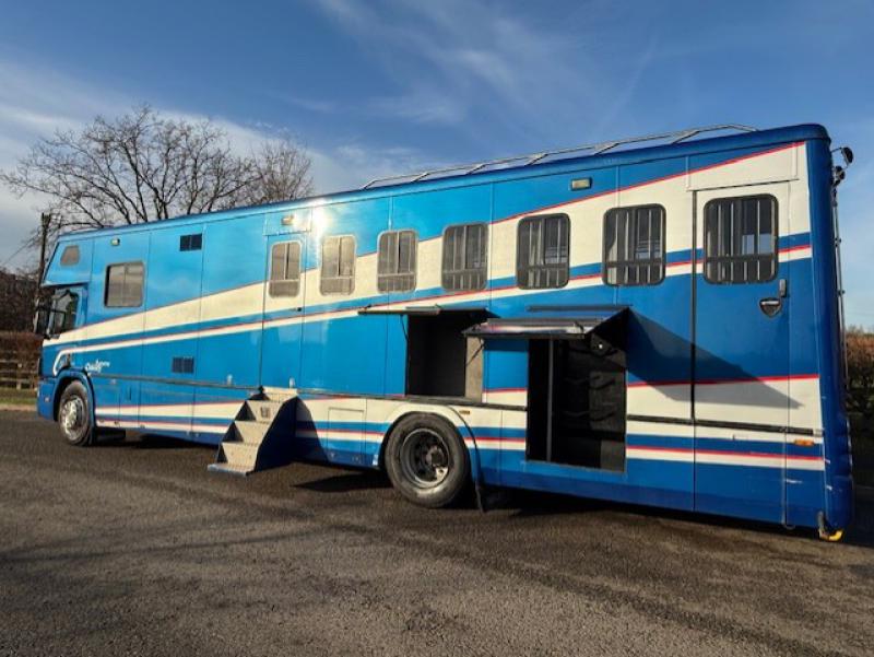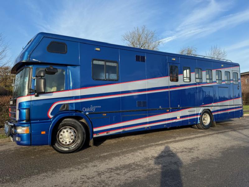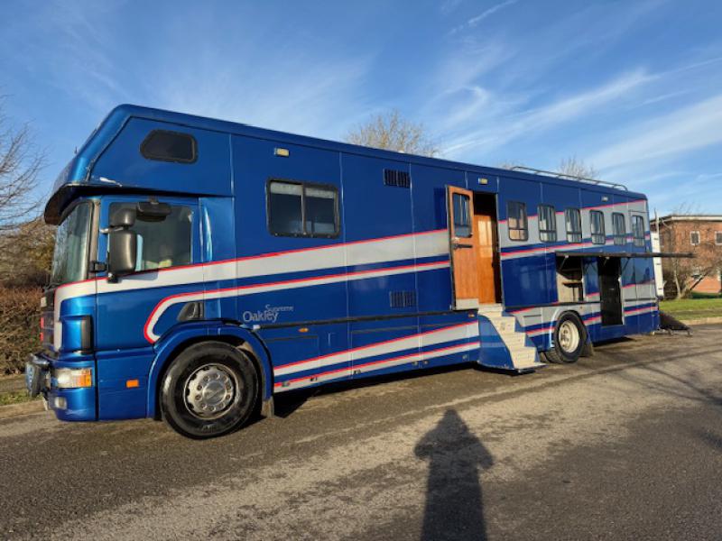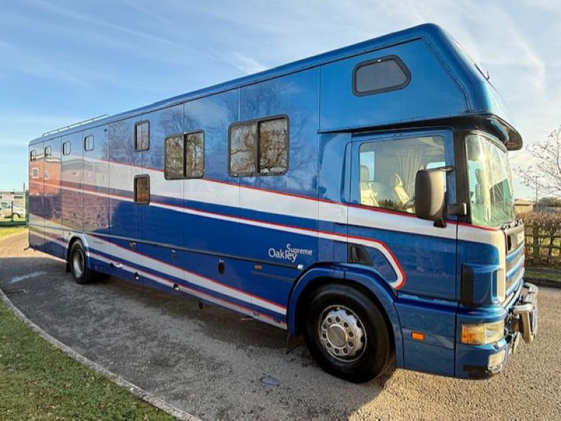 Scania 260 18,000 kg Coach built by Oakley Coach builders. Oakley Supreme Model Stalled for 5 with smart luxury living. Sleeping for 6. Large bathroom. Excellent condition throughout. Well maintained and looked after horsebox. EU Certified. High spec