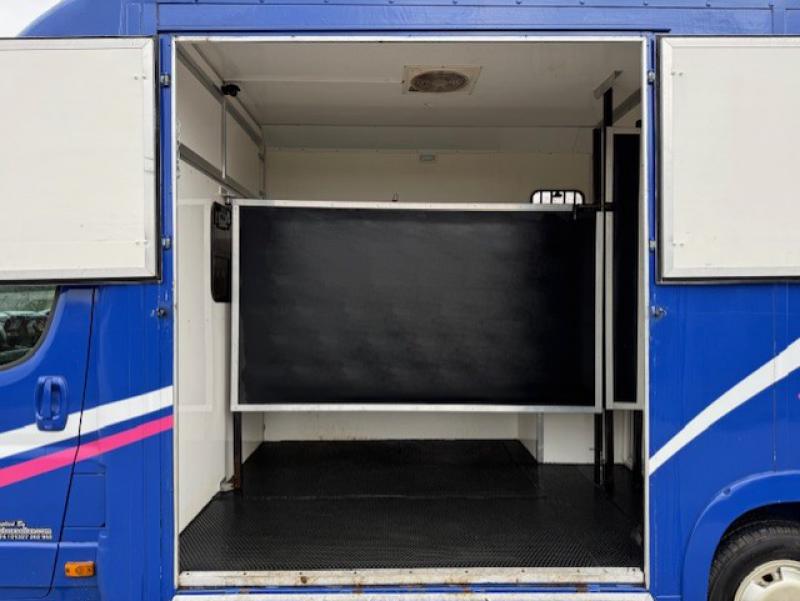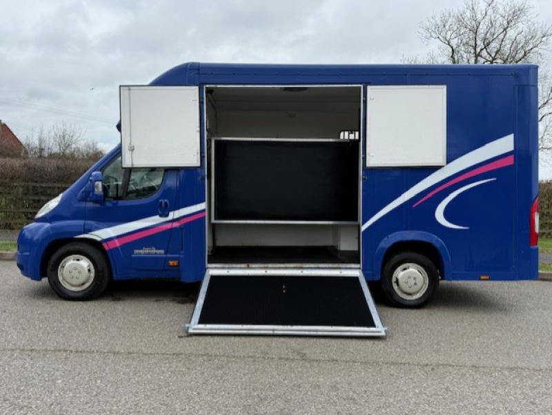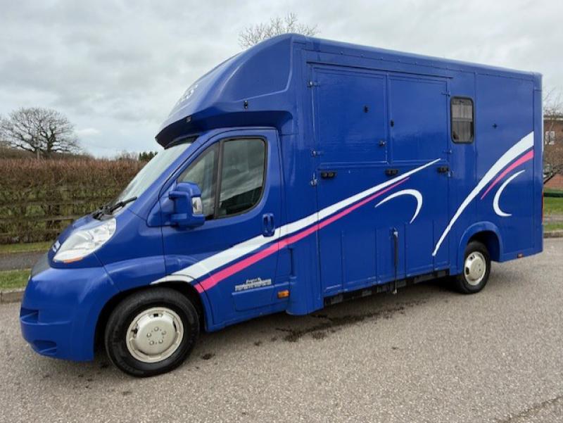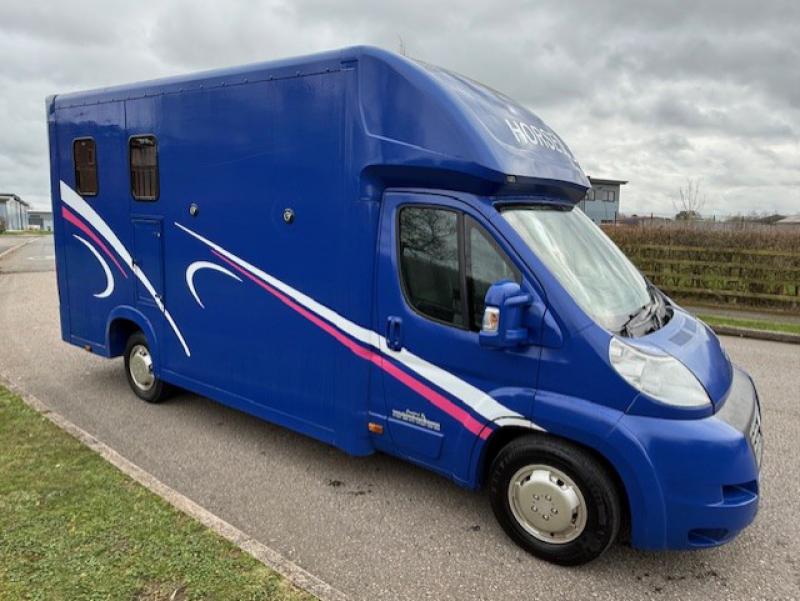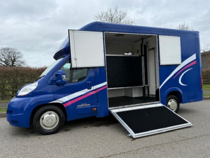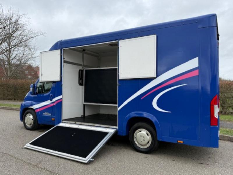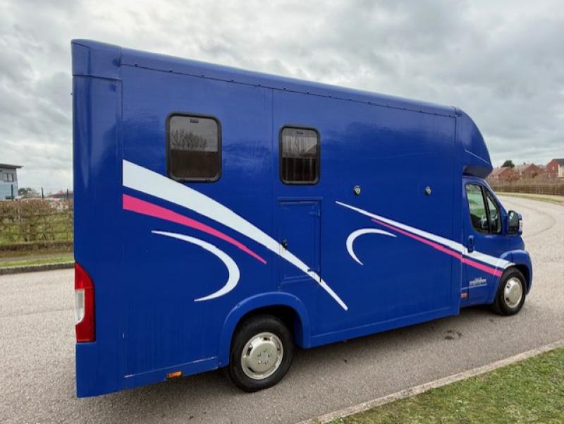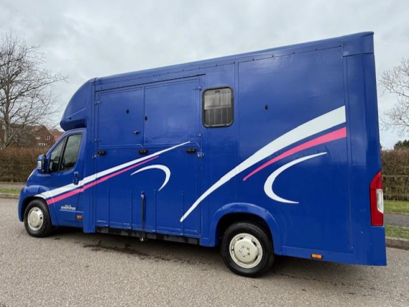 2015 Fiat Ducato 3.5 ton which can be uprated to 4.5 ton Coach built by Equi-babe Horseboxes. Weekender model Stalled for 2 rear facing. Full wall between horse area and changing area. Hob/Sink at rear. External tack locker..